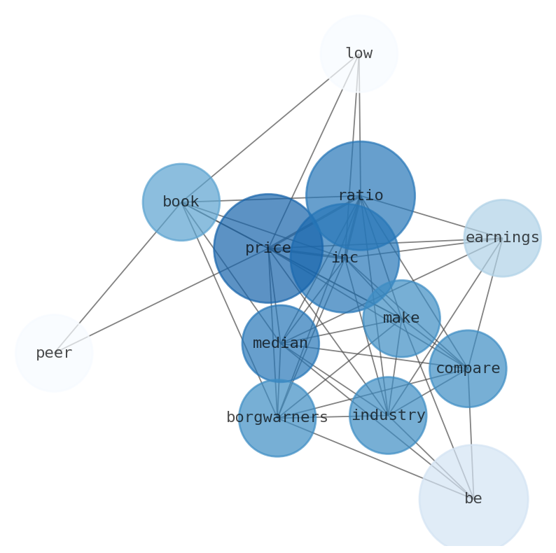 BorgWarner Inc.s price-earnings ratio is 73.6 compared to the industry median at 18.0. This makes BorgWarners Inc.s price-to-book ratio is lower than its peers.