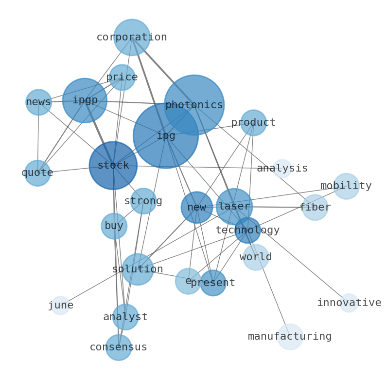 The game is changing. There is a new strategy to evaluate IPG Photonics fundamental value, possible risks and most salient advantages. Investors have traditionally relied in reading large amounts of text to evaluate the fundamental value of a stock or company. However, the development of Artificial Intelligence (AI) tools is modifying the way investments are evaluated in markets. Today, machine learning, natural language processing and bigdata allow making this process automatic, reducing large amounts of text to the elements that have a higher activation in a neural network. We programmed an artificial intelligence that reads the whole internet and the uses natural language processing and vectorizers to summarize the information. Usually, the AI reads several hundred pages and summarize it to a short document. This document presents our results. We found that the most common words in the internet about IPG Photonics are: IPG, Photonics, stock, IPGP, Corporation, Analyst, Strong, …
