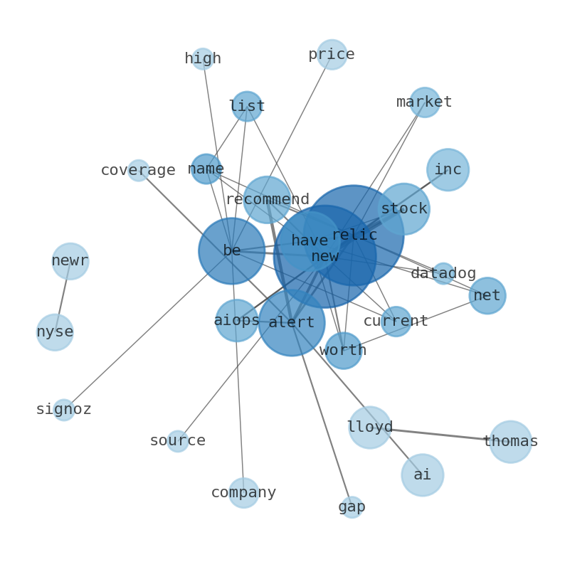 This document will help you to evaluate New Relic without reading an infinite amount of sources. Relying only on stock quotes or prices to make investment decisions is a mistake. Analyzing and observing stock charts, highs and lows and other numerical data does not allow to evaluate the real value of a company. Stock quotes and prices are the result of underlying characteristics of a company and of events and news happening around them. For this reason, investing must be based on information, not numbers. As a solution, we programmed an artificial intelligence that reads the whole internet and the uses natural language processing and vectorizers to summarize the information. Usually, the AI reads several hundred pages and summarize it to a short document. This document presents our results. We found that the most common words in the internet about New Relic are: New, Relic, alert, stock, recommend, AI, Thomas, and the most common words in the summary are: new, relic, security, news, stock, newr, alert, . One of the sentences in the summary was: New Relic has been named to 2023 people companies that care list.. Other searches related to this term that the AI found were: stockmarketlive, livestock, stockmarketforbeginners, thestockmarket, stockmarkettoday, stockmarkettrading, stockmarketstocks, todaystockmarket, thestockmarket, marketnews, stockmarketnews, whatisstockmarket, usstockmarket, stockmarketopen. #new #relic #security #news #stock #newr #alert.