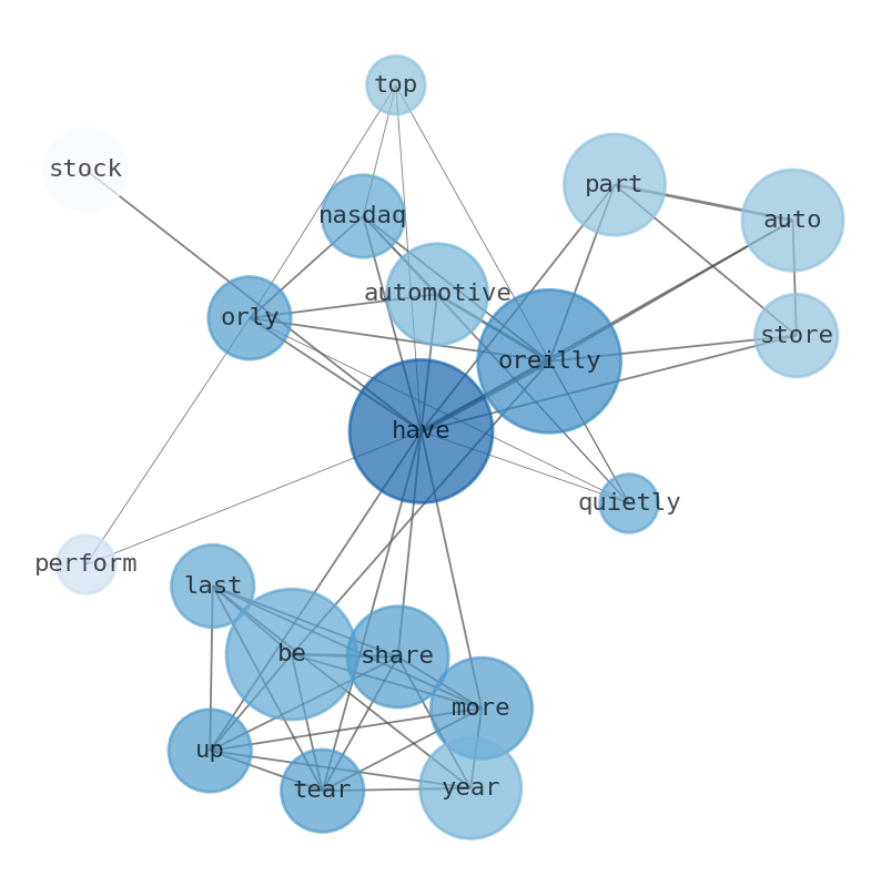 This document will help you to evaluate OReilly Automotive without reading an infinite amount of sources. Relying only on stock quotes or prices to make investment decisions is a mistake. Analyzing and observing stock charts, highs and lows and other numerical data does not allow to evaluate the real value of a company. Stock quotes and prices are the result of underlying characteristics of a company and of events and news happening around them. For this reason, investing must be based on information, not numbers. As a solution, we programmed an artificial intelligence that reads the whole internet and the uses natural language processing and vectorizers to summarize the information. Usually, the AI reads several hundred pages and summarize it to a short document. This document presents our results. We found that the most common words in the internet about OReilly Automotive are: OReilly, Automotive, share, year, NASDAQ, ORLY, stock, …