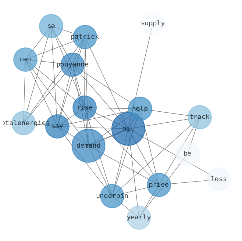 The game is changing. There is a new strategy to evaluate TotalEnergies SE fundamental value, possible risks and most salient advantages. Investors have traditionally relied in reading large amounts of text to evaluate the fundamental value of a stock or company. However, the development of Artificial Intelligence (AI) tools is modifying the way investments are evaluated in markets. Today, machine learning, natural language processing and bigdata allow making this process automatic, reducing large amounts of text to the elements that have a higher activation in a neural network. We programmed an artificial intelligence that reads the whole internet and the uses natural language processing and vectorizers to summarize the information. Usually, the AI reads several hundred pages and summarize it to a short document. This document presents our results. We found that the most common words in the internet about TotalEnergies SE are: demand, TotalEnergies, SE, CEO, Patrick, Pouyanne, say, …