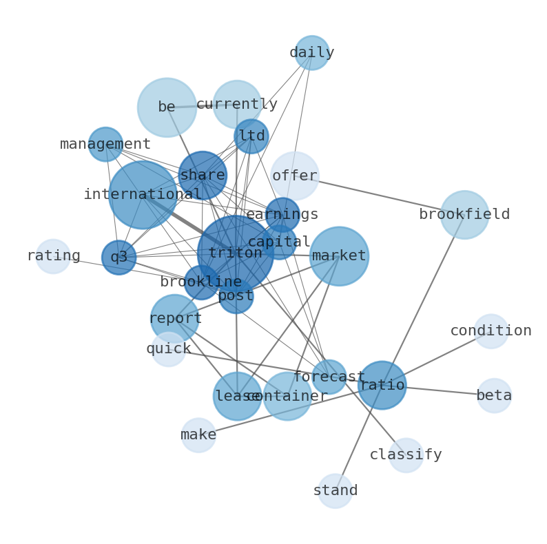 This document will help you to evaluate Triton International without reading an infinite amount of sources. Relying only on stock quotes or prices to make investment decisions is a mistake. Analyzing and observing stock charts, highs and lows and other numerical data does not allow to evaluate the real value of a company. Stock quotes and prices are the result of underlying characteristics of a company and of events and news happening around them. For this reason, investing must be based on information, not numbers. As a solution, we programmed an artificial intelligence that reads the whole internet and the uses natural language processing and vectorizers to summarize the information. Usually, the AI reads several hundred pages and summarize it to a short document. This document presents our results. We found that the most common words in the internet about Triton International are: Triton, International, Friday, Container, Leasing, Market, Report, …
