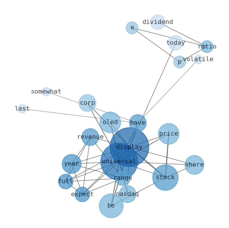 This document will help you to evaluate Universal Display without reading an infinite amount of sources. Relying only on stock quotes or prices to make investment decisions is a mistake. Analyzing and observing stock charts, highs and lows and other numerical data does not allow to evaluate the real value of a company. Stock quotes and prices are the result of underlying characteristics of a company and of events and news happening around them. For this reason, investing must be based on information, not numbers. As a solution, we programmed an artificial intelligence that reads the whole internet and the uses natural language processing and vectorizers to summarize the information. Usually, the AI reads several hundred pages and summarize it to a short document. This document presents our results. We found that the most common words in the internet about Universal Display are: Universal, Display, stock, OLED, share, price, revenue, …