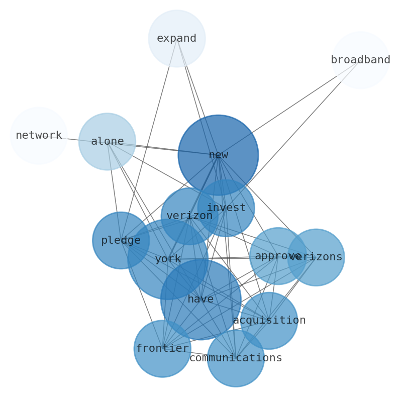 This document will help you to evaluate Verizon Communications without reading an infinite amount of sources. Relying only on stock quotes or prices to make investment decisions is a mistake. Analyzing and observing stock charts, highs and lows and other numerical data does not allow to evaluate the real value of a company. Stock quotes and prices are the result of underlying characteristics of a company and of events and news happening around them. For this reason, investing must be based on information, not numbers. As a solution, we programmed an artificial intelligence that reads the whole internet and the uses natural language processing and vectorizers to summarize the information. Usually, the AI reads several hundred pages and summarize it to a short document. This document presents our results. We found that the most common words in the internet about Verizon Communications are: New, York, approve, Verizons, acquisition, Frontier, Communications, …