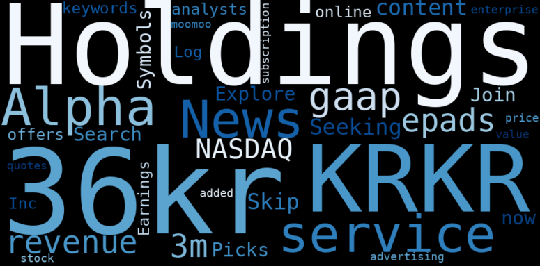 Are looking for the most relevant information about 36Kr Holdings? Investor spend a lot of time searching for information to make investment decisions in 36Kr Holdings. This task is often burdensome and consumes huge amounts of free time. It also leads to mistakes due to fatigue and bounded rationality. As a solution, we programmed an artificial intelligence that reads the whole internet and the uses natural language processing and vectorizers to summarize the information. Usually, the AI reads several hundred pages and summarize it to a short document. This document presents our results. We found that the most common words in the internet about 36Kr Holdings are: Alpha, Holdings, service, holding, gaap, epads, revenue, and the most common words in the summary are: holding, inc, stock, market, bloomberg, news, service, . One of the sentences in the summary was: Join now Search for Symbols, analysts, keywords Log in Earnings News. …