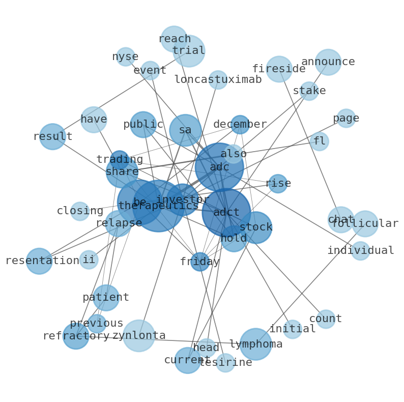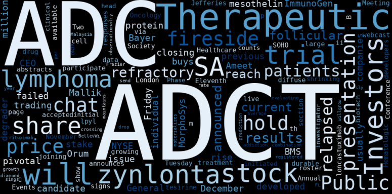 How much time have you spent trying to decide whether investing in ADC Therapeutics? Many investors start with the dream of being free. They expect to find on the stock market an option to have time to develop their own interests and hobbies. That is, a way to escape a 9 to 5 job. However, investment is complex and investors end up spending whole days (and nights) trying to figure out which the right stock to invest is. The dream of stock investing becomes the nightmare of facing infinity amounts of information. As a solution, we programmed an artificial intelligence that reads the whole internet and the uses natural language processing and vectorizers to summarize the information. Usually, the AI reads several hundred pages and summarize it to a short document. This document presents our results. We found that the most common words in the internet about ADC Therapeutics are: …