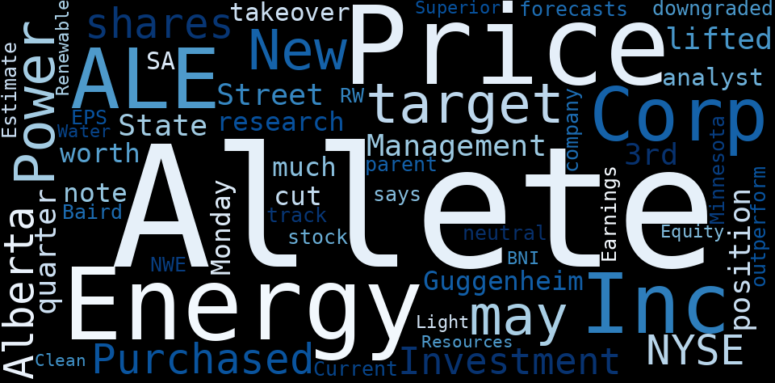 How much time have you spent trying to decide whether investing in ALLETE? Many investors start with the dream of being free. They expect to find on the stock market an option to have time to develop their own interests and hobbies. That is, a way to escape a 9 to 5 job. However, investment is complex and investors end up spending whole days (and nights) trying to figure out which the right stock to invest is. The dream of stock investing becomes the nightmare of facing infinity amounts of information. As a solution, we programmed an artificial intelligence that reads the whole internet and the uses natural language processing and vectorizers to summarize the information. Usually, the AI reads several hundred pages and summarize it to a short document. This document presents our results. We found that the most common words in the internet about ALLETE are: Allete, Energy, ALLETE, Inc, Corp, ALLEte, Price, and the most common words in the summary are: allete, bloomberg, company, name, inc, news, stock, . One of the sentences in the summary was: Guggenheim cut their price target on ALLEte from $49.00 to $41.00 in a research note on Monday. Other searches related to this term that the AI found were: stockmarketlive, livestock, stockmarketforbeginners, thestockmarket, stockmarkettoday, stockmarkettrading, stockmarketstocks, todaystockmarket, thestockmarket, marketnews, stockmarketnews, whatisstockmarket, usstockmarket, stockmarketopen. #allete #bloomberg #company #name #inc #news #stock.