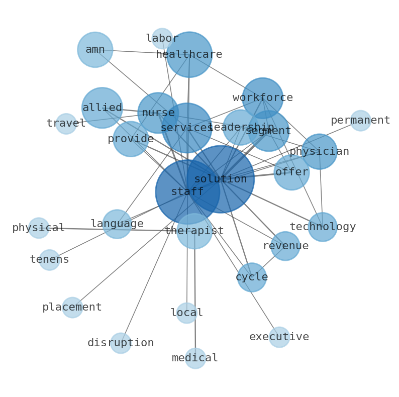 AMN Healthcare Services, Inc. provides healthcare workforce solutions and staffing services to hospitals and healthcare facilities in the United States. It operates through three segments: Nurse and Allied Solutions, Physician and Leadership Solutions, and Technology and Workforce Solutions. The Nurse and Allied Solutions segment offers travel nurse staffing, rapid response nurse staffing and labor disruption, allied staffing, local staffing, and revenue cycle solutions. The Physician and Leadership Solutions segment provides locum tenens staffing, healthcare interim leadership staffing, executive search, and physician permanent placement solutions. The Technology and Workforce Solutions segment offers language services, vendor management systems, workforce optimization, telehealth, credentialing, and outsourced solutions. The company also provides allied health professionals, such as physical therapists, respiratory therapists, occupational therapists, medical and radiology technologists, lab technicians, speech pathologists, rehabilitation assistants, and pharmacists. It offers its services under the brands, including American Mobile, Nursefinders, NurseChoice, HealthSource Global Staffing, Onward Healthcare, O'Grady Peyton International, Connetics, Med Travelers, Club Staffing, Staff Care, B.E. Smith, and Merritt Hawkins, as well as AMN Revenue Cycle Solutions and AMN Language Services. The company was founded in 1985 and is headquartered in Dallas, Texas.