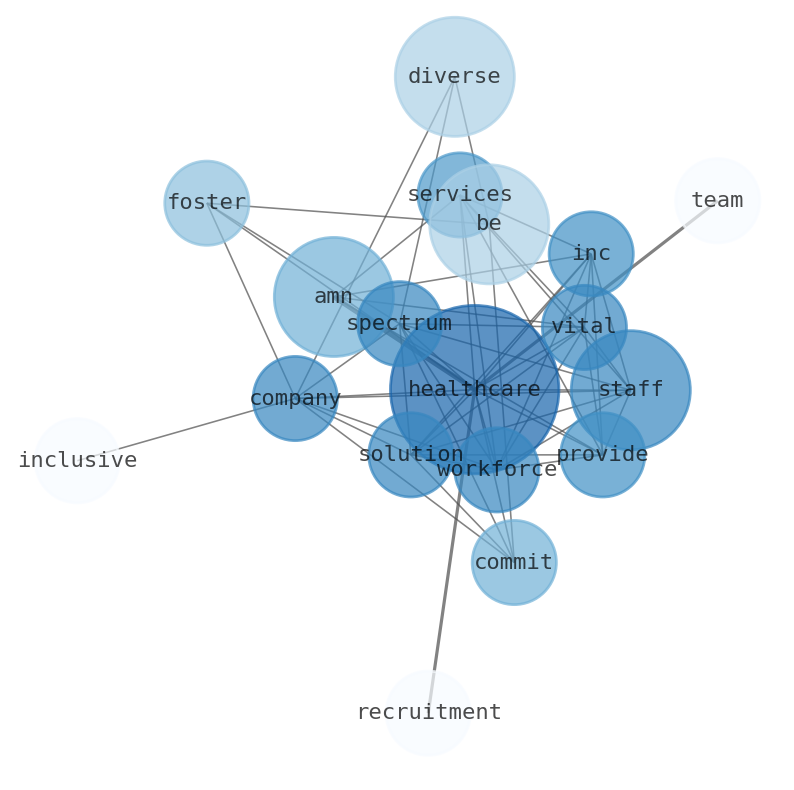 This document will help you to evaluate AMN Healthcare Services without reading an infinite amount of sources. Relying only on stock quotes or prices to make investment decisions is a mistake. Analyzing and observing stock charts, highs and lows and other numerical data does not allow to evaluate the real value of a company. Stock quotes and prices are the result of underlying characteristics of a company and of events and news happening around them. For this reason, investing must be based on information, not numbers. As a solution, we programmed an artificial intelligence that reads the whole internet and the uses natural language processing and vectorizers to summarize the information. Usually, the AI reads several hundred pages and summarize it to a short document. This document presents our results. We found that the most common words in the internet about AMN Healthcare Services are: AMN, Healthcare, staff, healthcare, diverse, …