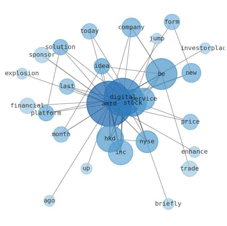 This document will help you to evaluate AMTD Digital without reading an infinite amount of sources. Relying only on stock quotes or prices to make investment decisions is a mistake. Analyzing and observing stock charts, highs and lows and other numerical data does not allow to evaluate the real value of a company. Stock quotes and prices are the result of underlying characteristics of a company and of events and news happening around them. For this reason, investing must be based on information, not numbers. As a solution, we programmed an artificial intelligence that reads the whole internet and the uses natural language processing and vectorizers to summarize the information. Usually, the AI reads several hundred pages and summarize it to a short document. This document presents our results. We found that the most common words in the internet about AMTD Digital are: AMTD, Digital, digital, stock, Inc, company, HKD, …