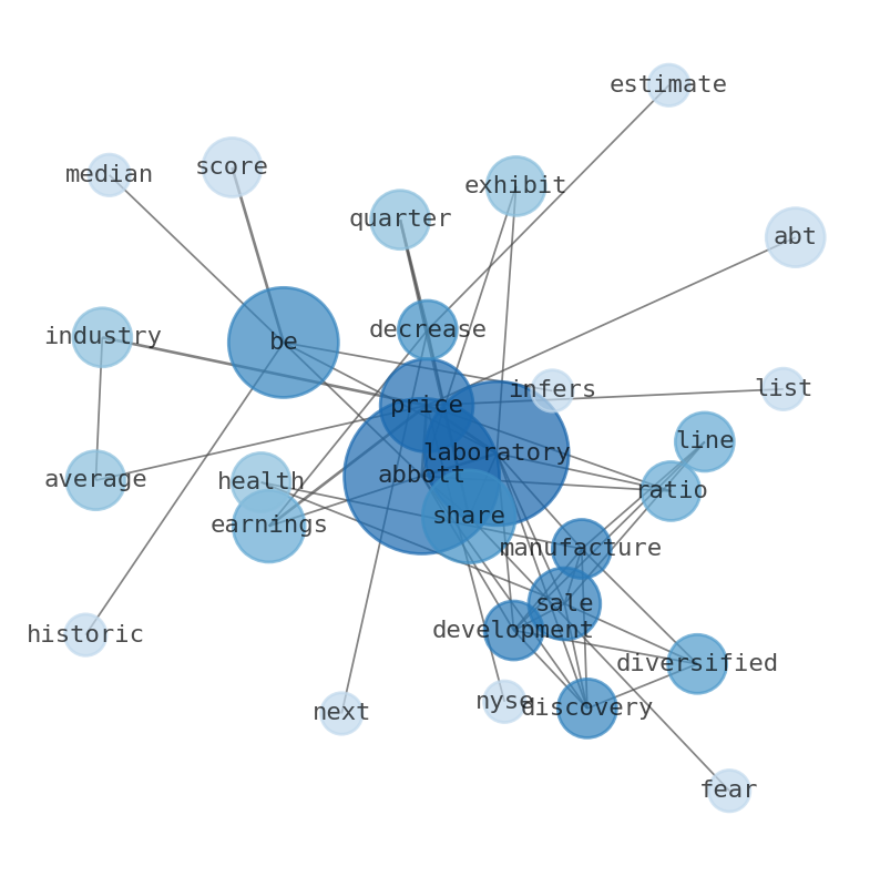 This document will help you to evaluate Abbott Laboratories without reading an infinite amount of sources. Relying only on stock quotes or prices to make investment decisions is a mistake. Analyzing and observing stock charts, highs and lows and other numerical data does not allow to evaluate the real value of a company. Stock quotes and prices are the result of underlying characteristics of a company and of events and news happening around them. For this reason, investing must be based on information, not numbers. As a solution, we programmed an artificial intelligence that reads the whole internet and the uses natural language processing and vectorizers to summarize the information. Usually, the AI reads several hundred pages and summarize it to a short document. This document presents our results. We found that the most common words in the internet about Abbott Laboratories are: Abbott, Laboratories, share, score, ABT, decrease, quarter, …