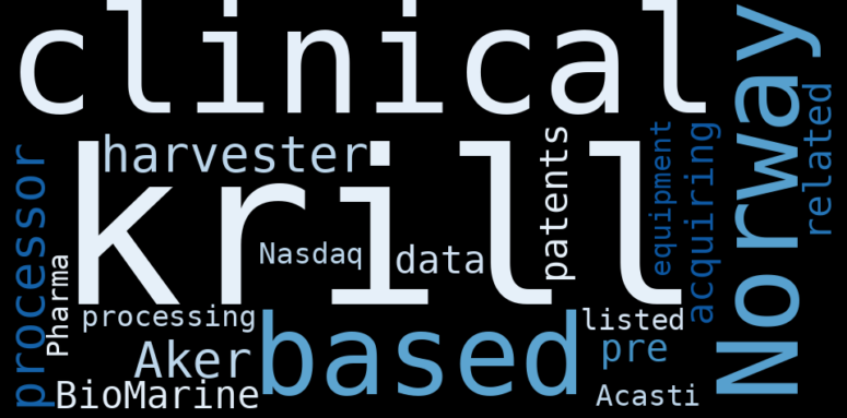 This document will help you to evaluate Acasti Pharma without reading an infinite amount of sources. Relying only on stock quotes or prices to make investment decisions is a mistake. Analyzing and observing stock charts, highs and lows and other numerical data does not allow to evaluate the real value of a company. Stock quotes and prices are the result of underlying characteristics of a company and of events and news happening around them. For this reason, investing must be based on information, not numbers. As a solution, we programmed an artificial intelligence that reads the whole internet and the uses natural language processing and vectorizers to summarize the information. Usually, the AI reads several hundred pages and summarize it to a short document. This document presents our results. We found that the most common words in the internet about Acasti Pharma are: krill, Norwaybased, harvester, processor, Aker, BioMarine, acquire, …