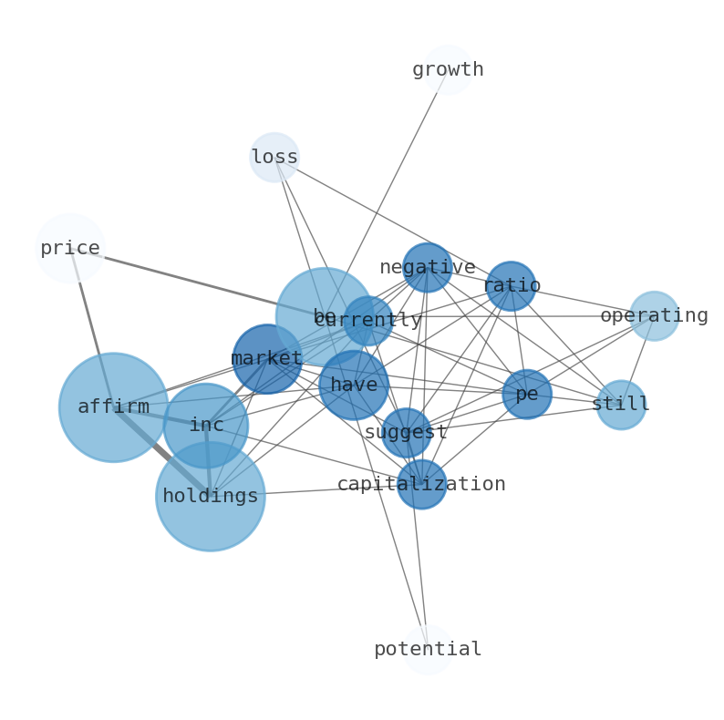 The game is changing. There is a new strategy to evaluate Affirm Holdings fundamental value, possible risks and most salient advantages. Investors have traditionally relied in reading large amounts of text to evaluate the fundamental value of a stock or company. However, the development of Artificial Intelligence (AI) tools is modifying the way investments are evaluated in markets. Today, machine learning, natural language processing and bigdata allow making this process automatic, reducing large amounts of text to the elements that have a higher activation in a neural network. We programmed an artificial intelligence that reads the whole internet and the uses natural language processing and vectorizers to summarize the information. Usually, the AI reads several hundred pages and summarize it to a short document. This document presents our results. We found that the most common words in the internet about Affirm Holdings are: Affirm, Holdings, Inc, market, price, currently, capitalization, …