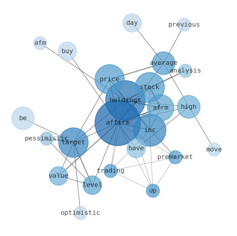 The game is changing. There is a new strategy to evaluate Affirm Holdings fundamental value, possible risks and most salient advantages. Investors have traditionally relied in reading large amounts of text to evaluate the fundamental value of a stock or company. However, the development of Artificial Intelligence (AI) tools is modifying the way investments are evaluated in markets. Today, machine learning, natural language processing and bigdata allow making this process automatic, reducing large amounts of text to the elements that have a higher activation in a neural network. We programmed an artificial intelligence that reads the whole internet and the uses natural language processing and vectorizers to summarize the information. Usually, the AI reads several hundred pages and summarize it to a short document. This document presents our results. We found that the most common words in the internet about Affirm Holdings are: Affirm, Holdings, Inc, stock, holding, target, price, …