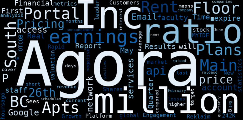How much time have you spent trying to decide whether investing in Agora? Many investors start with the dream of being free. They expect to find on the stock market an option to have time to develop their own interests and hobbies. That is, a way to escape a 9 to 5 job. However, investment is complex and investors end up spending whole days (and nights) trying to figure out which the right stock to invest is. The dream of stock investing becomes the nightmare of facing infinity amounts of information. As a solution, we programmed an artificial intelligence that reads the whole internet and the uses natural language processing and vectorizers to summarize the information. Usually, the AI reads several hundred pages and summarize it to a short document. This document presents our results. We found that the most common words in the internet about Agora are: Agora, Inc, …