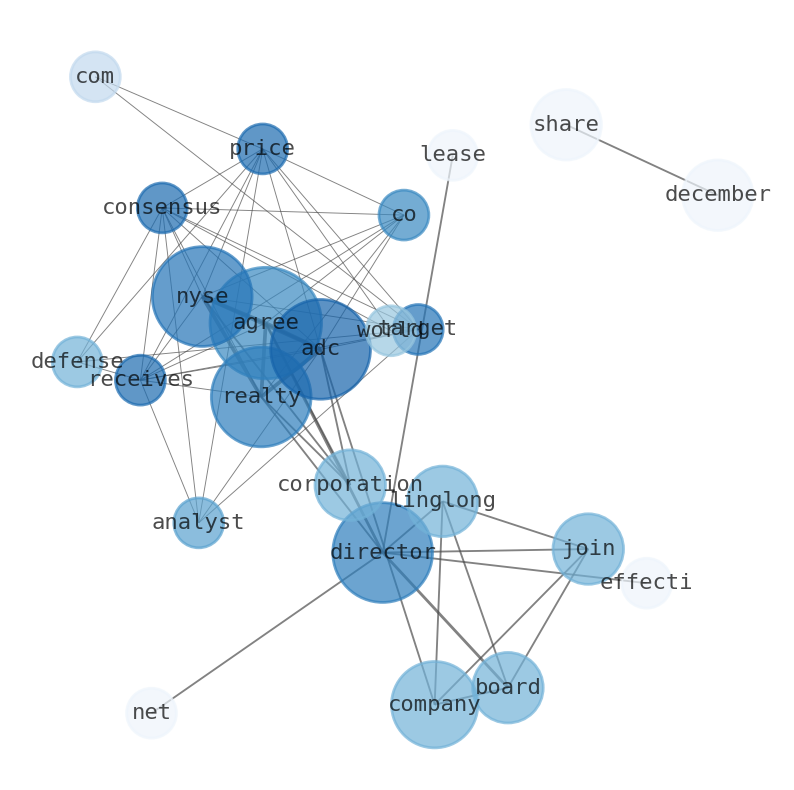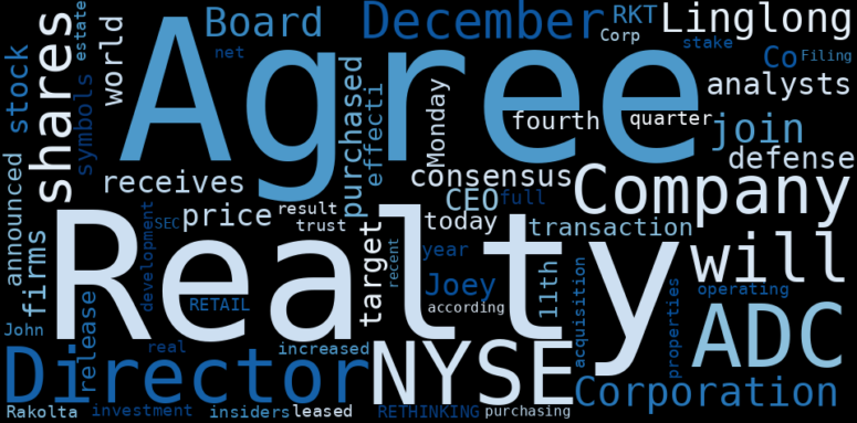 Are looking for the most relevant information about Agree Realty? Investor spend a lot of time searching for information to make investment decisions in Agree Realty. This task is often burdensome and consumes huge amounts of free time. It also leads to mistakes due to fatigue and bounded rationality. As a solution, we programmed an artificial intelligence that reads the whole internet and the uses natural language processing and vectorizers to summarize the information. Usually, the AI reads several hundred pages and summarize it to a short document. This document presents our results. We found that the most common words in the internet about Agree Realty are: Agree, Realty, purchase, share, December, Corporation, NYSE, and the most common words in the summary are: realty, agree, stock, income, market, news, corporation, . One of the sentences in the summary was: CEO Joey Agree purchased 1,350 shares of the firms stock in a transaction on Monday, December 11th. Other searches related to this term that the AI found were: stockmarketlive, livestock, stockmarketforbeginners, thestockmarket, stockmarkettoday, stockmarkettrading, stockmarketstocks, todaystockmarket, thestockmarket, marketnews, stockmarketnews, whatisstockmarket, usstockmarket, stockmarketopen. #realty #agree #stock #income #market #news #corporation.