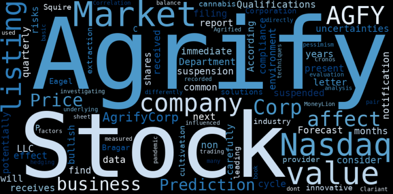 How much time have you spent trying to decide whether investing in Agrify? Many investors start with the dream of being free. They expect to find on the stock market an option to have time to develop their own interests and hobbies. That is, a way to escape a 9 to 5 job. However, investment is complex and investors end up spending whole days (and nights) trying to figure out which the right stock to invest is. The dream of stock investing becomes the nightmare of facing infinity amounts of information. As a solution, we programmed an artificial intelligence that reads the whole internet and the uses natural language processing and vectorizers to summarize the information. Usually, the AI reads several hundred pages and summarize it to a short document. This document presents our results. We found that the most common words in the internet about Agrify are: Agrify, Nasdaq, value, Stock, Market, AGFY, Corp, and the most common words in the summary are: stock, price, forecast, agrify, market, corp, close, . One of the sentences in the summary was: Bragar Eagel & Squire, P.C., is investigating Clariant, MoneyLion, Cronos and Agrified.. Other searches related to this term that the AI found were: stockmarketlive, livestock, stockmarketforbeginners, thestockmarket, stockmarkettoday, stockmarkettrading, stockmarketstocks, todaystockmarket, thestockmarket, marketnews, stockmarketnews, whatisstockmarket, usstockmarket, stockmarketopen. #stock #price #forecast #agrify #market #corp #close.