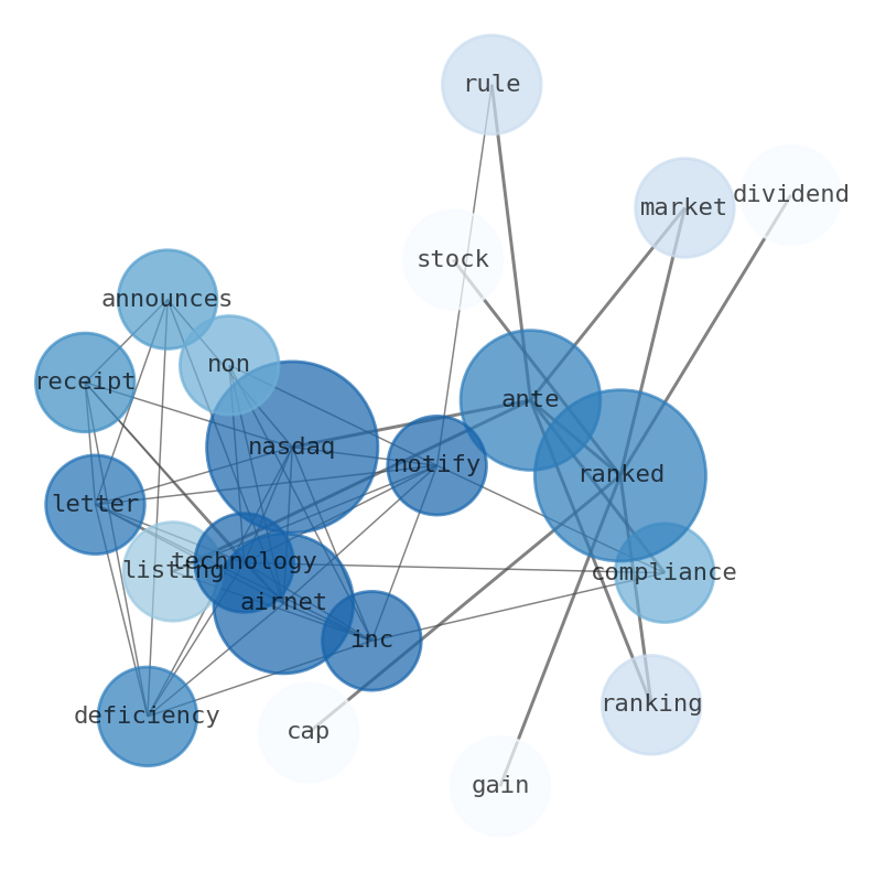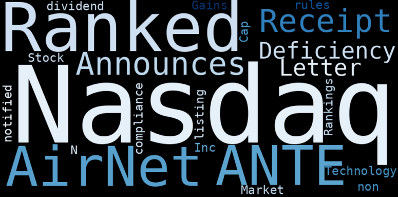 This document will help you to evaluate AirNet Technology without reading an infinite amount of sources. Relying only on stock quotes or prices to make investment decisions is a mistake. Analyzing and observing stock charts, highs and lows and other numerical data does not allow to evaluate the real value of a company. Stock quotes and prices are the result of underlying characteristics of a company and of events and news happening around them. For this reason, investing must be based on information, not numbers. As a solution, we programmed an artificial intelligence that reads the whole internet and the uses natural language processing and vectorizers to summarize the information. Usually, the AI reads several hundred pages and summarize it to a short document. This document presents our results. We found that the most common words in the internet about AirNet Technology are: Nasdaq, Ranked, AirNet, ANTE, Announces, Receipt, Deficiency, …