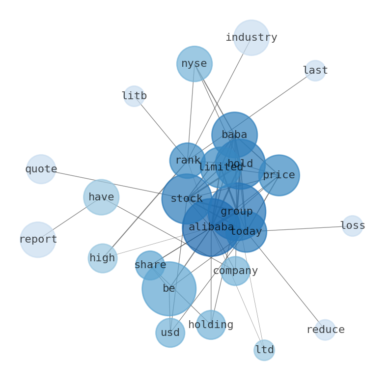 Are looking for the most relevant information about Alibaba Group Holding? Investor spend a lot of time searching for information to make investment decisions in Alibaba Group Holding. This task is often burdensome and consumes huge amounts of free time. It also leads to mistakes due to fatigue and bounded rationality. As a solution, we programmed an artificial intelligence that reads the whole internet and the uses natural language processing and vectorizers to summarize the information. Usually, the AI reads several hundred pages and summarize it to a short document. This document presents our results. We found that the most common words in the internet about Alibaba Group Holding are: Alibaba, Group, Holding, stock, BABA, rank, industry, and the most common words in the summary are: stock, alibaba, group, hold, market, baba, price, . One of the sentences in the summary was: Company has reported average annual revenue growth of …