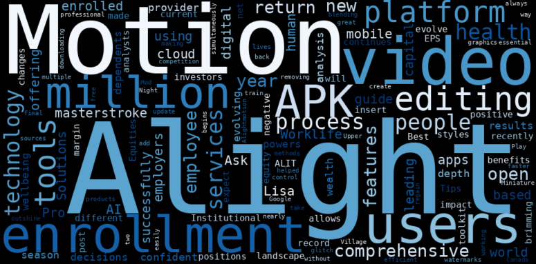 This document will help you to evaluate Alight without reading an infinite amount of sources. Relying only on stock quotes or prices to make investment decisions is a mistake. Analyzing and observing stock charts, highs and lows and other numerical data does not allow to evaluate the real value of a company. Stock quotes and prices are the result of underlying characteristics of a company and of events and news happening around them. For this reason, investing must be based on information, not numbers. As a solution, we programmed an artificial intelligence that reads the whole internet and the uses natural language processing and vectorizers to summarize the information. Usually, the AI reads several hundred pages and summarize it to a short document. This document presents our results. We found that the most common words in the internet about Alight are: Alight, Motion, enrollment, video, APK, edit, user, and the …