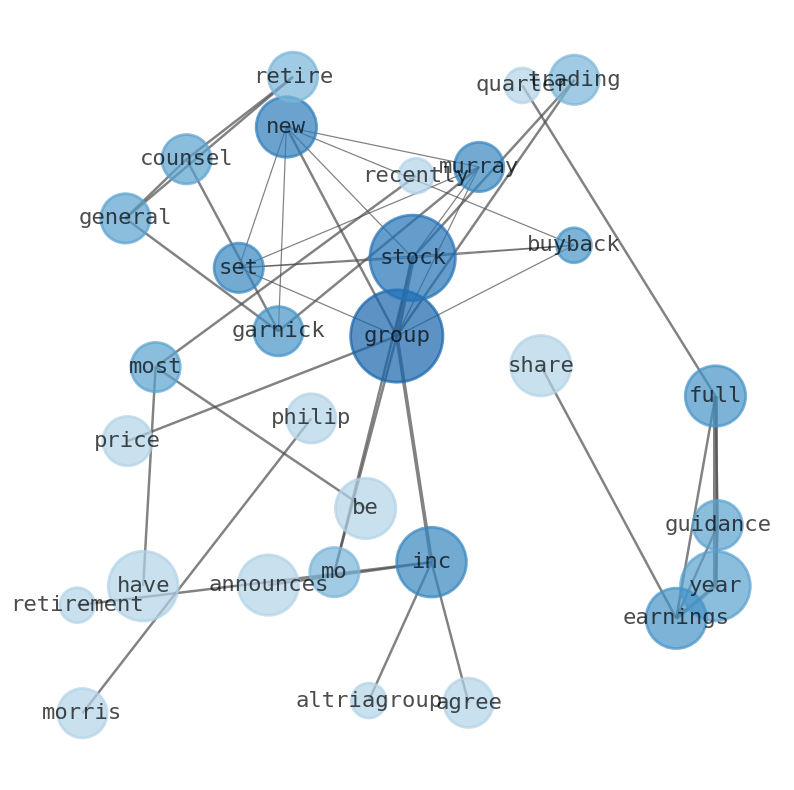 This document will help you to evaluate Altria Group without reading an infinite amount of sources. Relying only on stock quotes or prices to make investment decisions is a mistake. Analyzing and observing stock charts, highs and lows and other numerical data does not allow to evaluate the real value of a company. Stock quotes and prices are the result of underlying characteristics of a company and of events and news happening around them. For this reason, investing must be based on information, not numbers. As a solution, we programmed an artificial intelligence that reads the whole internet and the uses natural language processing and vectorizers to summarize the information. Usually, the AI reads several hundred pages and summarize it to a short document. This document presents our results. We found that the most common words in the internet about Altria Group are: Altria, Group, stock, Inc, set, new, Murray, and the most common words in the summary are: altria, stock, group, mo, market, dividend, price, . One of the sentences in the summary was: Murray R. Other searches related to this term that the AI found were: stockmarketlive, livestock, stockmarketforbeginners, thestockmarket, stockmarkettoday, stockmarkettrading, stockmarketstocks, todaystockmarket, thestockmarket, marketnews, stockmarketnews, whatisstockmarket, usstockmarket, stockmarketopen. #altria #stock #group #mo #market #dividend #price.