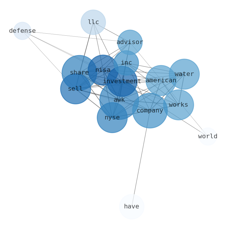 How much time have you spent trying to decide whether investing in American Water Works Company? Many investors start with the dream of being free. They expect to find on the stock market an option to have time to develop their own interests and hobbies. That is, a way to escape a 9 to 5 job. However, investment is complex and investors end up spending whole days (and nights) trying to figure out which the right stock to invest is. The dream of stock investing becomes the nightmare of facing infinity amounts of information. As a solution, we programmed an artificial intelligence that reads the whole internet and the uses natural language processing and vectorizers to summarize the information. Usually, the AI reads several hundred pages and summarize it to a short document. This document presents our results. We found that the most common words in the internet about American Water Works Company are: American, Water, Works, Company, Shares, sell, nisa, and the most common words in the summary are: water, american, stock, work, company, news, market, . One of the sentences in the summary was: nisa Investment Advisors LLC. Other searches related to this term that the AI found were: stockmarketlive, livestock, stockmarketforbeginners, thestockmarket, stockmarkettoday, stockmarkettrading, stockmarketstocks, todaystockmarket, thestockmarket, marketnews, stockmarketnews, whatisstockmarket, usstockmarket, stockmarketopen. #water #american #stock #work #company #news #market.