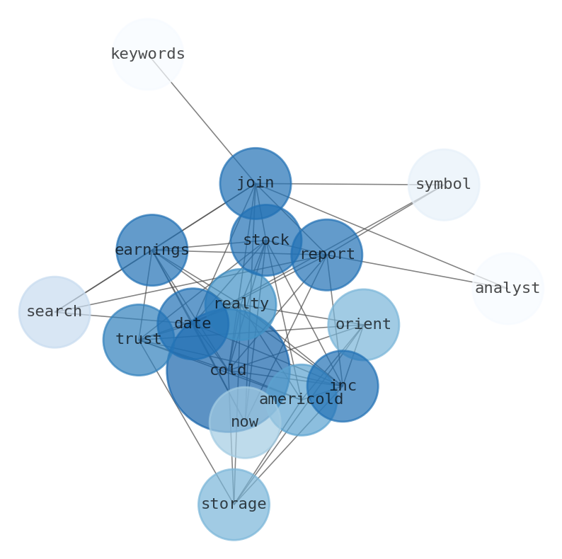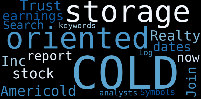 Are looking for the most relevant information about Americold Realty Trust? Investor spend a lot of time searching for information to make investment decisions in Americold Realty Trust. This task is often burdensome and consumes huge amounts of free time. It also leads to mistakes due to fatigue and bounded rationality. As a solution, we programmed an artificial intelligence that reads the whole internet and the uses natural language processing and vectorizers to summarize the information. Usually, the AI reads several hundred pages and summarize it to a short document. This document presents our results. We found that the most common words in the internet about Americold Realty Trust are: COLD, Coldstorageoriented, Americold, Realty, Trust, Inc, stock, and the most common words in the summary are: inc, good, price, trust, llc, risky, group, . One of the sentences in the summary was: (COLD) stock earnings dates & report. Other searches related to this term that the AI found were: stockmarketlive, livestock, stockmarketforbeginners, thestockmarket, stockmarkettoday, stockmarkettrading, stockmarketstocks, todaystockmarket, thestockmarket, marketnews, stockmarketnews, whatisstockmarket, usstockmarket, stockmarketopen. #inc #good #price #trust #llc #risky #group.