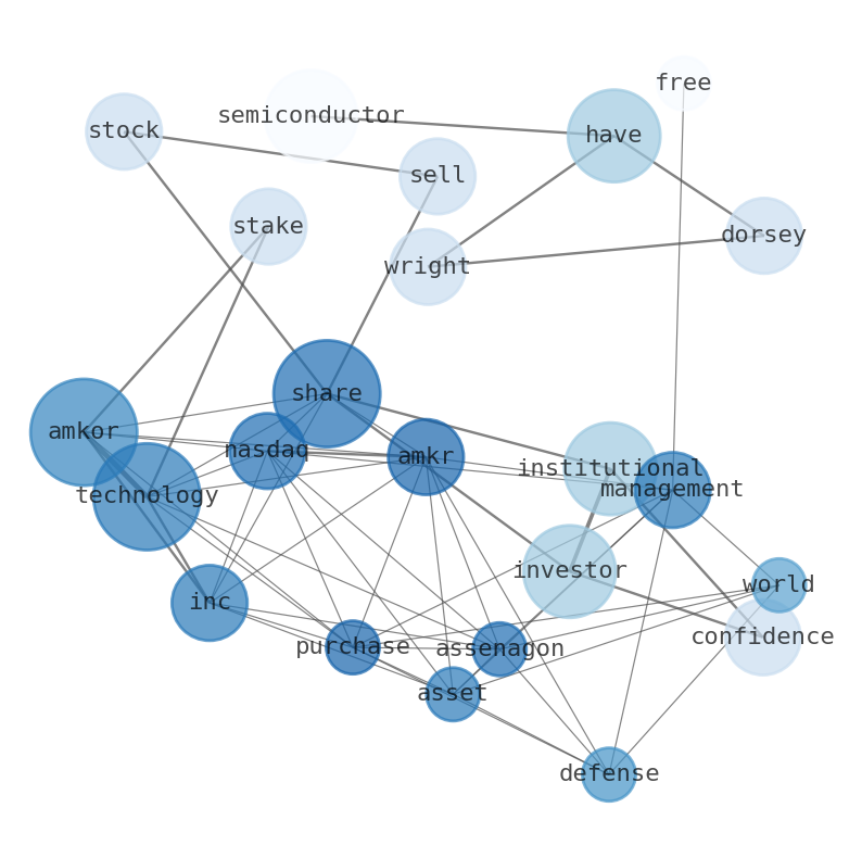 This document will help you to evaluate Amkor Technology without reading an infinite amount of sources. Relying only on stock quotes or prices to make investment decisions is a mistake. Analyzing and observing stock charts, highs and lows and other numerical data does not allow to evaluate the real value of a company. Stock quotes and prices are the result of underlying characteristics of a company and of events and news happening around them. For this reason, investing must be based on information, not numbers. As a solution, we programmed an artificial intelligence that reads the whole internet and the uses natural language processing and vectorizers to summarize the information. Usually, the AI reads several hundred pages and summarize it to a short document. This document presents our results. We found that the most common words in the internet about Amkor Technology are: share, Amkor, Technology, semiconductor, investor, Inc, sell, …