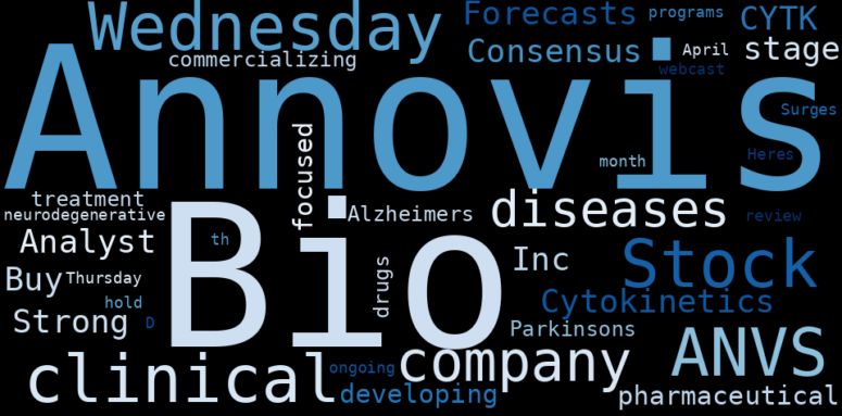 How much time have you spent trying to decide whether investing in Annovis Bio? Many investors start with the dream of being free. They expect to find on the stock market an option to have time to develop their own interests and hobbies. That is, a way to escape a 9 to 5 job. However, investment is complex and investors end up spending whole days (and nights) trying to figure out which the right stock to invest is. The dream of stock investing becomes the nightmare of facing infinity amounts of information. As a solution, we programmed an artificial intelligence that reads the whole internet and the uses natural language processing and vectorizers to summarize the information. Usually, the AI reads several hundred pages and summarize it to a short document. This document presents our results. We found that the most common words in the internet about Annovis Bio are: …