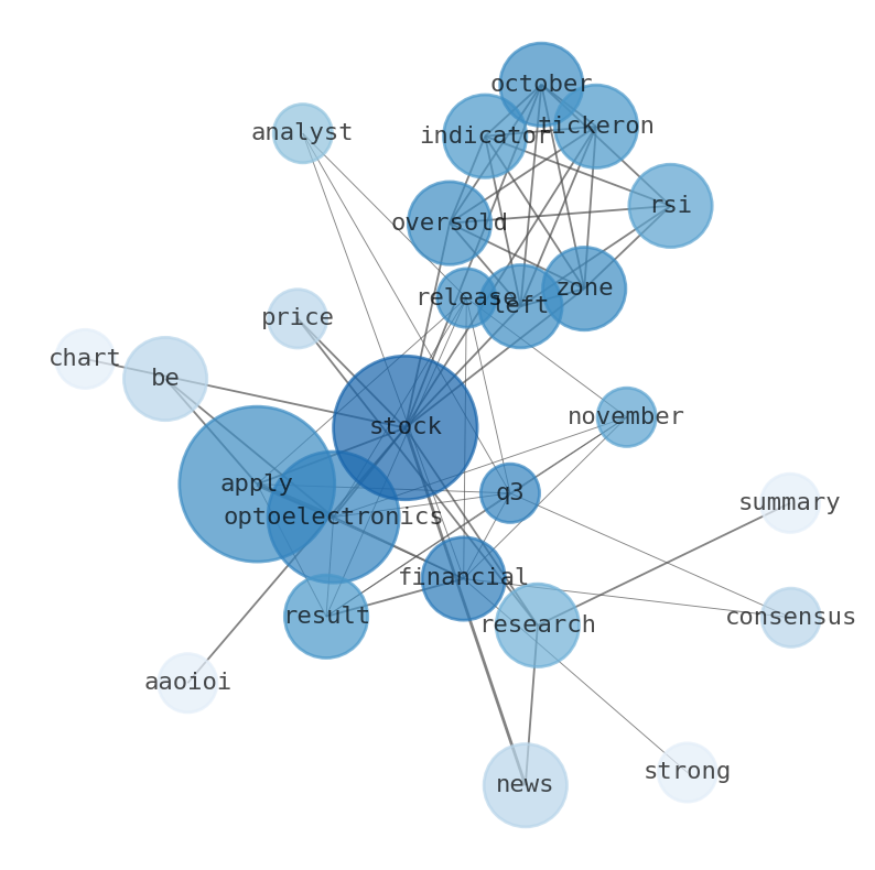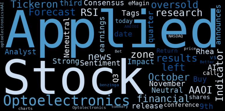 Are looking for the most relevant information about Applied Optoelectronics? Investor spend a lot of time searching for information to make investment decisions in Applied Optoelectronics. This task is often burdensome and consumes huge amounts of free time. It also leads to mistakes due to fatigue and bounded rationality. As a solution, we programmed an artificial intelligence that reads the whole internet and the uses natural language processing and vectorizers to summarize the information. Usually, the AI reads several hundred pages and summarize it to a short document. This document presents our results. We found that the most common words in the internet about Applied Optoelectronics are: Applied, Optoelectronics, stock, financial, result, AAOI, RSI, and the most common words in the summary are: optoelectronics, apply, stock, aaoi, inc, quantum, optic, . One of the sentences in the summary was: Applied Optoelectronics (AAOI, $6.91) RSI Indicator left the oversold zone on …