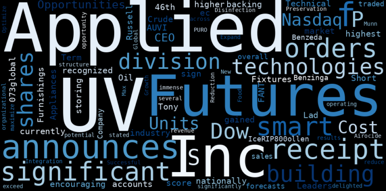 How much time have you spent trying to decide whether investing in Applied UV? Many investors start with the dream of being free. They expect to find on the stock market an option to have time to develop their own interests and hobbies. That is, a way to escape a 9 to 5 job. However, investment is complex and investors end up spending whole days (and nights) trying to figure out which the right stock to invest is. The dream of stock investing becomes the nightmare of facing infinity amounts of information. As a solution, we programmed an artificial intelligence that reads the whole internet and the uses natural language processing and vectorizers to summarize the information. Usually, the AI reads several hundred pages and summarize it to a short document. This document presents our results. We found that the most common words in the internet about Applied UV are: …