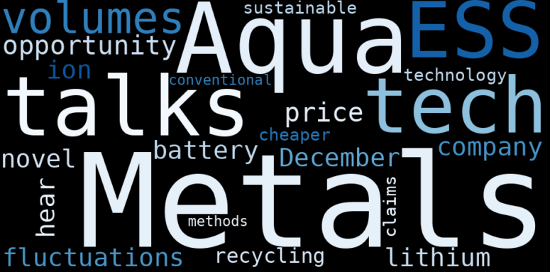 Are looking for the most relevant information about Aqua Metals? Investor spend a lot of time searching for information to make investment decisions in Aqua Metals. This task is often burdensome and consumes huge amounts of free time. It also leads to mistakes due to fatigue and bounded rationality. As a solution, we programmed an artificial intelligence that reads the whole internet and the uses natural language processing and vectorizers to summarize the information. Usually, the AI reads several hundred pages and summarize it to a short document. This document presents our results. We found that the most common words in the internet about Aqua Metals are: Aqua, Metals, talk, tech, ESS, volume, opportunity, and the most common words in the summary are: aqua, metal, pool, water, follow, tile, mosaic, . One of the sentences in the summary was: Aqua Metals talks tech, ESS volumes and the opportunity in metals …