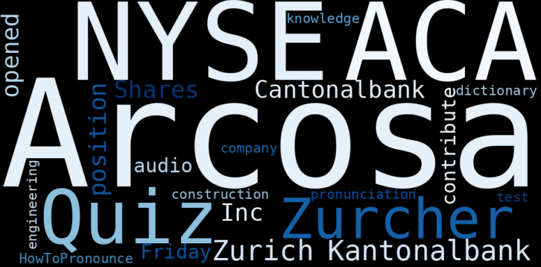 Are looking for the most relevant information about Arcosa? Investor spend a lot of time searching for information to make investment decisions in Arcosa. This task is often burdensome and consumes huge amounts of free time. It also leads to mistakes due to fatigue and bounded rationality. As a solution, we programmed an artificial intelligence that reads the whole internet and the uses natural language processing and vectorizers to summarize the information. Usually, the AI reads several hundred pages and summarize it to a short document. This document presents our results. We found that the most common words in the internet about Arcosa are: Arcosa, Zurcher, Kantonalbank, Zurich, Cantonalbank, position, Inc, and the most common words in the summary are: arcosa, job, investment, inc, capacity, mar, company, . One of the sentences in the summary was: You can contribute this audio pronunciation of Arcosa to HowToPronounce dictionary. Other searches related to this term that the AI found were: stockmarketlive, livestock, stockmarketforbeginners, thestockmarket, stockmarkettoday, stockmarkettrading, stockmarketstocks, todaystockmarket, thestockmarket, marketnews, stockmarketnews, whatisstockmarket, usstockmarket, stockmarketopen. #arcosa #job #investment #inc #capacity #mar #company.