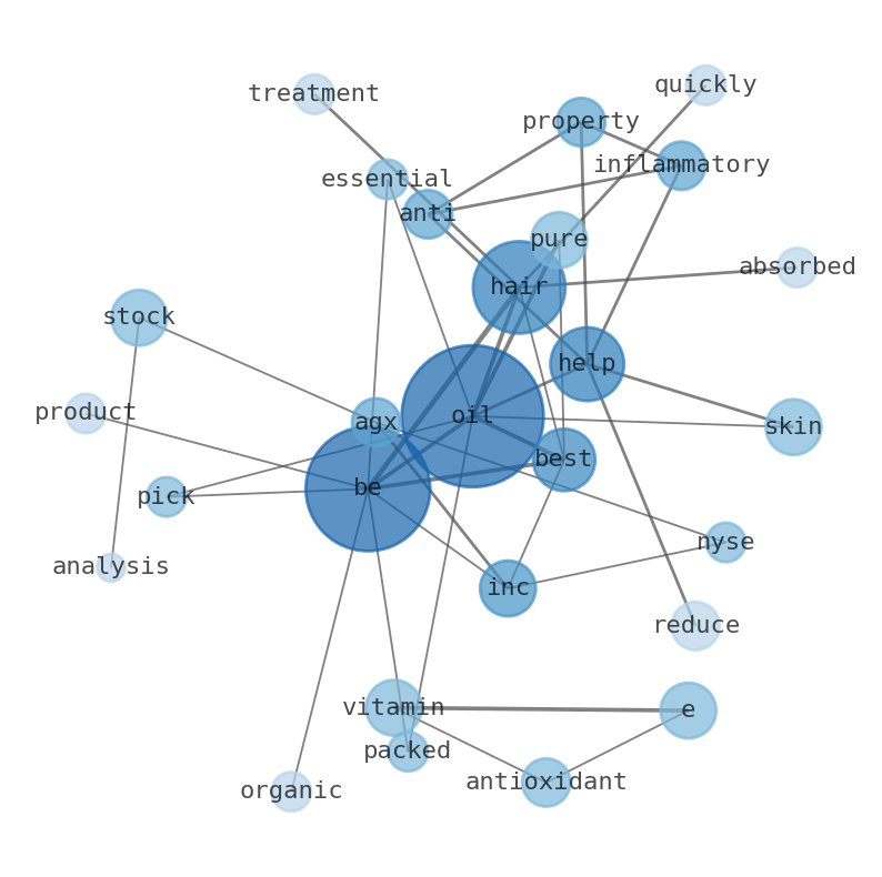 This document will help you to evaluate Argan without reading an infinite amount of sources. Relying only on stock quotes or prices to make investment decisions is a mistake. Analyzing and observing stock charts, highs and lows and other numerical data does not allow to evaluate the real value of a company. Stock quotes and prices are the result of underlying characteristics of a company and of events and news happening around them. For this reason, investing must be based on information, not numbers. As a solution, we programmed an artificial intelligence that reads the whole internet and the uses natural language processing and vectorizers to summarize the information. Usually, the AI reads several hundred pages and summarize it to a short document. This document presents our results. We found that the most common words in the internet about Argan are: Argan, oil, Oil, argan, Hair, help, E, and the …