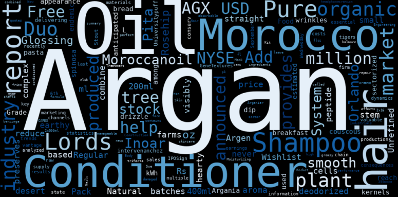 Are looking for the most relevant information about Argan? Investor spend a lot of time searching for information to make investment decisions in Argan. This task is often burdensome and consumes huge amounts of free time. It also leads to mistakes due to fatigue and bounded rationality. As a solution, we programmed an artificial intelligence that reads the whole internet and the uses natural language processing and vectorizers to summarize the information. Usually, the AI reads several hundred pages and summarize it to a short document. This document presents our results. We found that the most common words in the internet about Argan are: Argan, Oil, oil, argan, Morocco, Conditioner, market, and the most common words in the summary are: argan, oil, hair, add, price, shop, market, . One of the sentences in the summary was: Argan Oil market is a plant oil produced from the kernels of the argan tree (Argania spinosa L.) that is endemic to Morocco. Other searches related to this term that the AI found were: stockmarketlive, livestock, stockmarketforbeginners, thestockmarket, stockmarkettoday, stockmarkettrading, stockmarketstocks, todaystockmarket, thestockmarket, marketnews, stockmarketnews, whatisstockmarket, usstockmarket, stockmarketopen. #argan #oil #hair #add #price #shop #market.