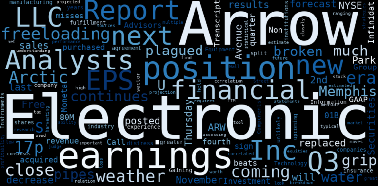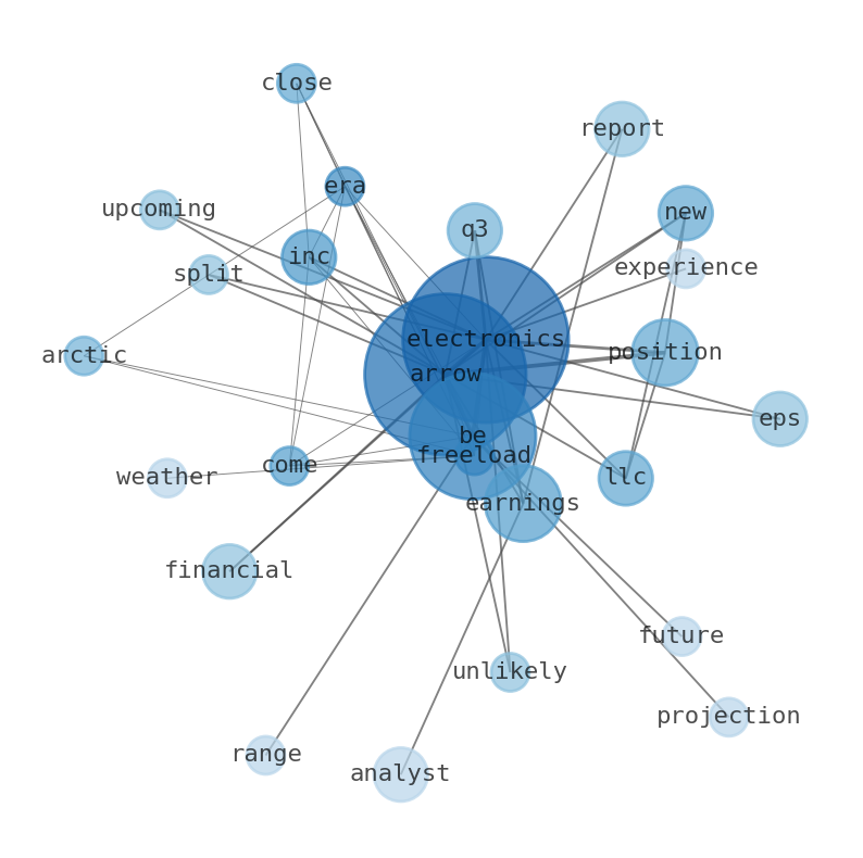 This document will help you to evaluate Arrow Electronics without reading an infinite amount of sources. Relying only on stock quotes or prices to make investment decisions is a mistake. Analyzing and observing stock charts, highs and lows and other numerical data does not allow to evaluate the real value of a company. Stock quotes and prices are the result of underlying characteristics of a company and of events and news happening around them. For this reason, investing must be based on information, not numbers. As a solution, we programmed an artificial intelligence that reads the whole internet and the uses natural language processing and vectorizers to summarize the information. Usually, the AI reads several hundred pages and summarize it to a short document. This document presents our results. We found that the most common words in the internet about Arrow Electronics are: Arrow, Electronics, position, Inc, earnings, Q3, LLC, …