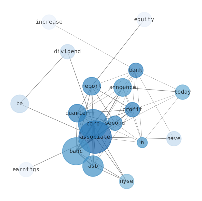 This document will help you to evaluate Associated Banc-Corp without reading an infinite amount of sources. Relying only on stock quotes or prices to make investment decisions is a mistake. Analyzing and observing stock charts, highs and lows and other numerical data does not allow to evaluate the real value of a company. Stock quotes and prices are the result of underlying characteristics of a company and of events and news happening around them. For this reason, investing must be based on information, not numbers. As a solution, we programmed an artificial intelligence that reads the whole internet and the uses natural language processing and vectorizers to summarize the information. Usually, the AI reads several hundred pages and summarize it to a short document. This document presents our results. We found that the most common words in the internet about Associated Banc-Corp are: Associated, BancCorp, ASB, report, announce, secondquarter, profit, …