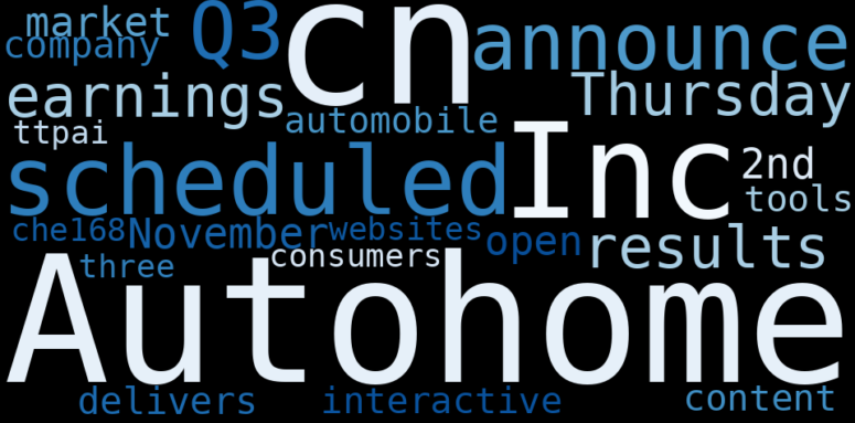 This document will help you to evaluate Autohome without reading an infinite amount of sources. Relying only on stock quotes or prices to make investment decisions is a mistake. Analyzing and observing stock charts, highs and lows and other numerical data does not allow to evaluate the real value of a company. Stock quotes and prices are the result of underlying characteristics of a company and of events and news happening around them. For this reason, investing must be based on information, not numbers. As a solution, we programmed an artificial intelligence that reads the whole internet and the uses natural language processing and vectorizers to summarize the information. Usually, the AI reads several hundred pages and summarize it to a short document. This document presents our results. We found that the most common words in the internet about Autohome are: Autohome, Inc, schedule, announce, Q3, earnings, result, and the …