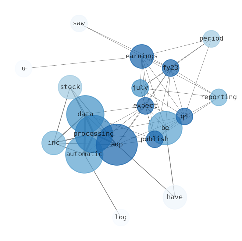 This document will help you to evaluate Automatic Data Processing without reading an infinite amount of sources. Relying only on stock quotes or prices to make investment decisions is a mistake. Analyzing and observing stock charts, highs and lows and other numerical data does not allow to evaluate the real value of a company. Stock quotes and prices are the result of underlying characteristics of a company and of events and news happening around them. For this reason, investing must be based on information, not numbers. As a solution, we programmed an artificial intelligence that reads the whole internet and the uses natural language processing and vectorizers to summarize the information. Usually, the AI reads several hundred pages and summarize it to a short document. This document presents our results. We found that the most common words in the internet about Automatic Data Processing are: Automatic, Data, ADP, Processing, earnings, Inc, stock, and the most common words in the summary are: data, stock, automatic, market, adp, process, price, . One of the sentences in the summary was: Automatic Data Processing (ADP) is expected to publish its Q4 FY23 earnings on July 26. Other searches related to this term that the AI found were: stockmarketlive, livestock, stockmarketforbeginners, thestockmarket, stockmarkettoday, stockmarkettrading, stockmarketstocks, todaystockmarket, thestockmarket, marketnews, stockmarketnews, whatisstockmarket, usstockmarket, stockmarketopen. #data #stock #automatic #market #adp #process #price.