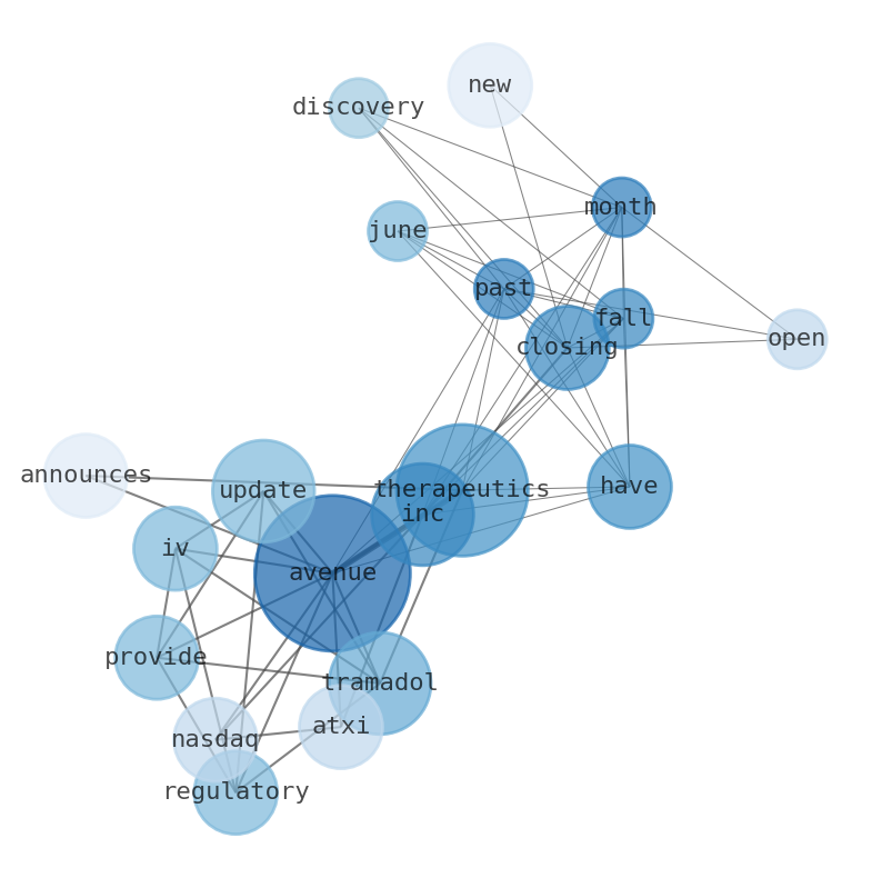 Are looking for the most relevant information about Avenue Therapeutics? Investor spend a lot of time searching for information to make investment decisions in Avenue Therapeutics. This task is often burdensome and consumes huge amounts of free time. It also leads to mistakes due to fatigue and bounded rationality. As a solution, we programmed an artificial intelligence that reads the whole internet and the uses natural language processing and vectorizers to summarize the information. Usually, the AI reads several hundred pages and summarize it to a short document. This document presents our results. We found that the most common words in the internet about Avenue Therapeutics are: Avenue, Therapeutics, Inc, close, new, study, IV, and the most common words in the summary are: excipient, therapeutic, avenue, phase, sodium, overview, polysorbate, . One of the sentences in the summary was: Avenue Theraputics provides regulatory update on IV tramadol.. Other searches related …