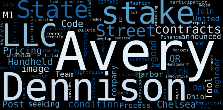 The game is changing. There is a new strategy to evaluate Avery Dennison fundamental value, possible risks and most salient advantages. Investors have traditionally relied in reading large amounts of text to evaluate the fundamental value of a stock or company. However, the development of Artificial Intelligence (AI) tools is modifying the way investments are evaluated in markets. Today, machine learning, natural language processing and bigdata allow making this process automatic, reducing large amounts of text to the elements that have a higher activation in a neural network. We programmed an artificial intelligence that reads the whole internet and the uses natural language processing and vectorizers to summarize the information. Usually, the AI reads several hundred pages and summarize it to a short document. This document presents our results. We found that the most common words in the internet about Avery Dennison are: Avery, Dennison, stake, Street, LLC, contract, M1, and the most common words in the summary are: avery, dennison, film, market, share, job, material, . One of the sentences in the summary was: Lazard Asset Management LLC boosted its stake. Other searches related to this term that the AI found were: stockmarketlive, livestock, stockmarketforbeginners, thestockmarket, stockmarkettoday, stockmarkettrading, stockmarketstocks, todaystockmarket, thestockmarket, marketnews, stockmarketnews, whatisstockmarket, usstockmarket, stockmarketopen. #avery #dennison #film #market #share #job #material.