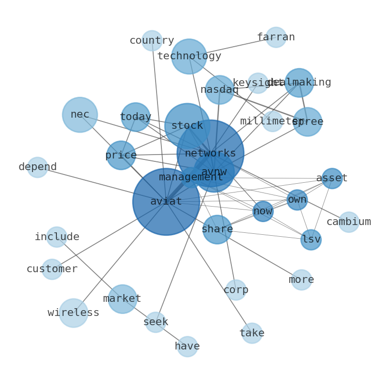 This document will help you to evaluate Aviat Networks without reading an infinite amount of sources. Relying only on stock quotes or prices to make investment decisions is a mistake. Analyzing and observing stock charts, highs and lows and other numerical data does not allow to evaluate the real value of a company. Stock quotes and prices are the result of underlying characteristics of a company and of events and news happening around them. For this reason, investing must be based on information, not numbers. As a solution, we programmed an artificial intelligence that reads the whole internet and the uses natural language processing and vectorizers to summarize the information. Usually, the AI reads several hundred pages and summarize it to a short document. This document presents our results. We found that the most common words in the internet about Aviat Networks are: Aviat, Networks, stock, NEC, share, network, price, …