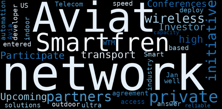 This document will help you to evaluate Aviat Networks without reading an infinite amount of sources. Relying only on stock quotes or prices to make investment decisions is a mistake. Analyzing and observing stock charts, highs and lows and other numerical data does not allow to evaluate the real value of a company. Stock quotes and prices are the result of underlying characteristics of a company and of events and news happening around them. For this reason, investing must be based on information, not numbers. As a solution, we programmed an artificial intelligence that reads the whole internet and the uses natural language processing and vectorizers to summarize the information. Usually, the AI reads several hundred pages and summarize it to a short document. This document presents our results. We found that the most common words in the internet about Aviat Networks are: network, Aviat, private, Smartfren, partner, initiative, wireless, …