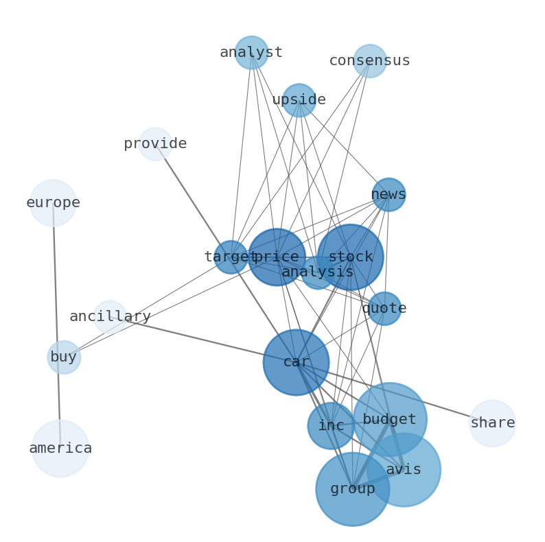 The game is changing. There is a new strategy to evaluate Avis Budget Group fundamental value, possible risks and most salient advantages. Investors have traditionally relied in reading large amounts of text to evaluate the fundamental value of a stock or company. However, the development of Artificial Intelligence (AI) tools is modifying the way investments are evaluated in markets. Today, machine learning, natural language processing and bigdata allow making this process automatic, reducing large amounts of text to the elements that have a higher activation in a neural network. We programmed an artificial intelligence that reads the whole internet and the uses natural language processing and vectorizers to summarize the information. Usually, the AI reads several hundred pages and summarize it to a short document. This document presents our results. We found that the most common words in the internet about Avis Budget Group are: Avis, Group, Budget, stock, car, Inc, price, and the most common words in the summary are: avis, budget, group, car, job, rental, stock, . One of the sentences in the summary was: Hertz global Holdings and the Avis Budget Group have been hit by rising costs, growth in ride-hailing.. Other searches related to this term that the AI found were: stockmarketlive, livestock, stockmarketforbeginners, thestockmarket, stockmarkettoday, stockmarkettrading, stockmarketstocks, todaystockmarket, thestockmarket, marketnews, stockmarketnews, whatisstockmarket, usstockmarket, stockmarketopen. #avis #budget #group #car #job #rental #stock.
