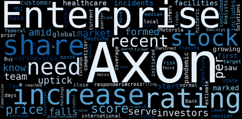 How much time have you spent trying to decide whether investing in Axon Enterprise? Many investors start with the dream of being free. They expect to find on the stock market an option to have time to develop their own interests and hobbies. That is, a way to escape a 9 to 5 job. However, investment is complex and investors end up spending whole days (and nights) trying to figure out which the right stock to invest is. The dream of stock investing becomes the nightmare of facing infinity amounts of information. As a solution, we programmed an artificial intelligence that reads the whole internet and the uses natural language processing and vectorizers to summarize the information. Usually, the AI reads several hundred pages and summarize it to a short document. This document presents our results. We found that the most common words in the internet about Axon Enterprise are: …