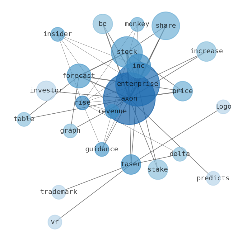 This document will help you to evaluate Axon Enterprise without reading an infinite amount of sources. Relying only on stock quotes or prices to make investment decisions is a mistake. Analyzing and observing stock charts, highs and lows and other numerical data does not allow to evaluate the real value of a company. Stock quotes and prices are the result of underlying characteristics of a company and of events and news happening around them. For this reason, investing must be based on information, not numbers. As a solution, we programmed an artificial intelligence that reads the whole internet and the uses natural language processing and vectorizers to summarize the information. Usually, the AI reads several hundred pages and summarize it to a short document. This document presents our results. We found that the most common words in the internet about Axon Enterprise are: Axon, Enterprise, stock, Inc, forecast, share, Enterprises, …
