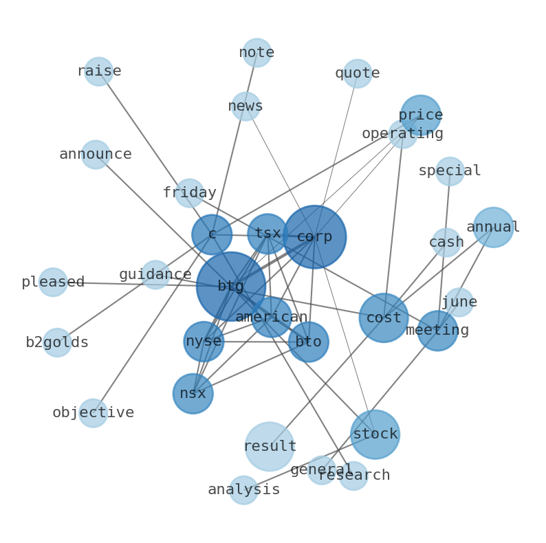 Are looking for the most relevant information about B2Gold? Investor spend a lot of time searching for information to make investment decisions in B2Gold. This task is often burdensome and consumes huge amounts of free time. It also leads to mistakes due to fatigue and bounded rationality. As a solution, we programmed an artificial intelligence that reads the whole internet and the uses natural language processing and vectorizers to summarize the information. Usually, the AI reads several hundred pages and summarize it to a short document. This document presents our results. We found that the most common words in the internet about B2Gold are: B2Gold, Corp, B2gold, btg, BTG, stock, price, and the most common words in the summary are: b2gold, corp, btg, gold, report, company, share, . One of the sentences in the summary was: btg | b2gold corp. Other searches related to this term that the AI found …