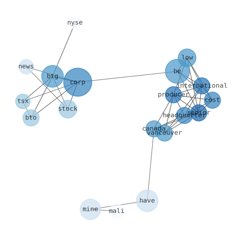 Are looking for the most relevant information about B2Gold? Investor spend a lot of time searching for information to make investment decisions in B2Gold. This task is often burdensome and consumes huge amounts of free time. It also leads to mistakes due to fatigue and bounded rationality. As a solution, we programmed an artificial intelligence that reads the whole internet and the uses natural language processing and vectorizers to summarize the information. Usually, the AI reads several hundred pages and summarize it to a short document. This document presents our results. We found that the most common words in the internet about B2Gold are: B2Gold, Corp, gold, Namibia, B2, BTG, today, and the most common words in the summary are: b2gold, gold, stock, namibia, corp, news, answer, . One of the sentences in the summary was: B2Gold Corp. Other searches related to this term that the AI found were: stockmarketlive, …