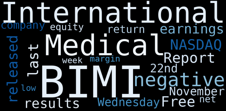 This document will help you to evaluate BIMI International Medical without reading an infinite amount of sources. Relying only on stock quotes or prices to make investment decisions is a mistake. Analyzing and observing stock charts, highs and lows and other numerical data does not allow to evaluate the real value of a company. Stock quotes and prices are the result of underlying characteristics of a company and of events and news happening around them. For this reason, investing must be based on information, not numbers. As a solution, we programmed an artificial intelligence that reads the whole internet and the uses natural language processing and vectorizers to summarize the information. Usually, the AI reads several hundred pages and summarize it to a short document. This document presents our results. We found that the most common words in the internet about BIMI International Medical are: International, Medical, negative, BIMI, NASDAQBIMI, …