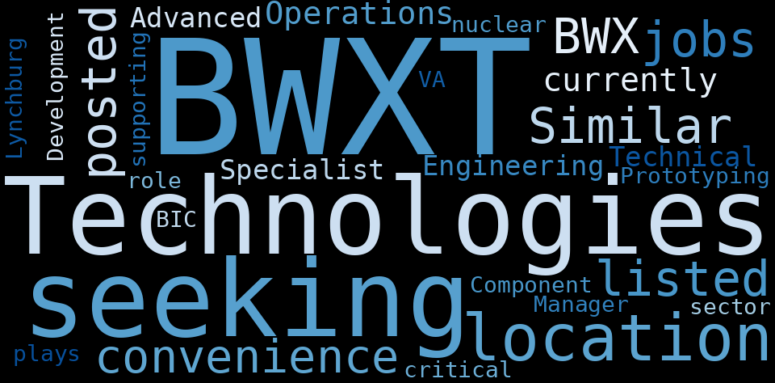 This document will help you to evaluate BWX Technologies without reading an infinite amount of sources. Relying only on stock quotes or prices to make investment decisions is a mistake. Analyzing and observing stock charts, highs and lows and other numerical data does not allow to evaluate the real value of a company. Stock quotes and prices are the result of underlying characteristics of a company and of events and news happening around them. For this reason, investing must be based on information, not numbers. As a solution, we programmed an artificial intelligence that reads the whole internet and the uses natural language processing and vectorizers to summarize the information. Usually, the AI reads several hundred pages and summarize it to a short document. This document presents our results. We found that the most common words in the internet about BWX Technologies are: BWXT, Technologies, seek, location, Similar, job, post, and the most common words in the summary are: job, technology, jan, bwxt, bloomberg, bwx, mi, . One of the sentences in the summary was: BWXT plays a critical role in supporting the nuclear sector.. Other searches related to this term that the AI found were: stockmarketlive, livestock, stockmarketforbeginners, thestockmarket, stockmarkettoday, stockmarkettrading, stockmarketstocks, todaystockmarket, thestockmarket, marketnews, stockmarketnews, whatisstockmarket, usstockmarket, stockmarketopen. #job #technology #jan #bwxt #bloomberg #bwx #mi.